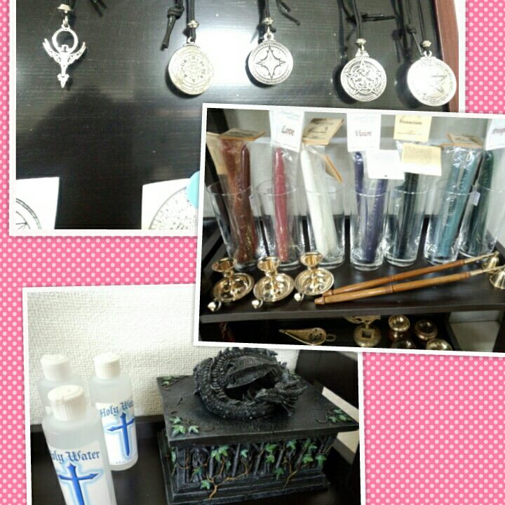 中段がスペルキャンドルといって、術が仕込まれているキャンドルです。霊視能力アップなど能力開発系から恋愛や金運など多岐に渡ります。1日で焚いたり3日に分けて焚いたりすることで効果を発揮します。あと、キャンドルグッズとして、キャンドル立てと、キャンドルスナッファーというキャンドルの灯りを消す道具も仕入れました。