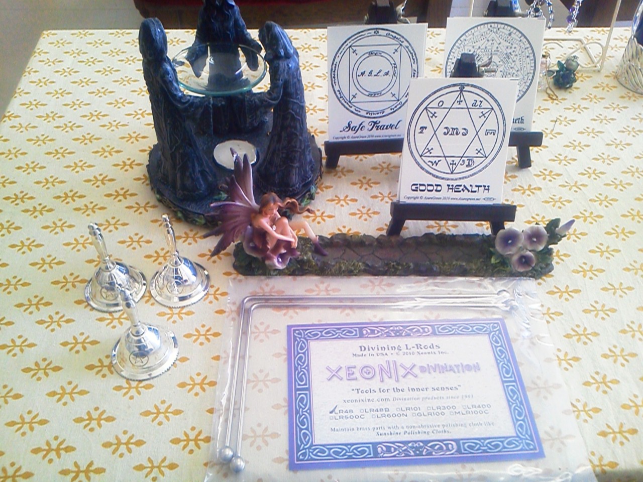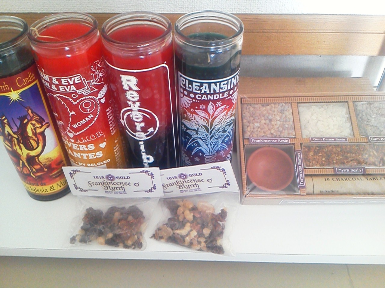 中段がスペルキャンドルといって、術が仕込まれているキャンドルです。霊視能力アップなど能力開発系から恋愛や金運など多岐に渡ります。1日で焚いたり3日に分けて焚いたりすることで効果を発揮します。あと、キャンドルグッズとして、キャンドル立てと、キャンドルスナッファーというキャンドルの灯りを消す道具も仕入れました。